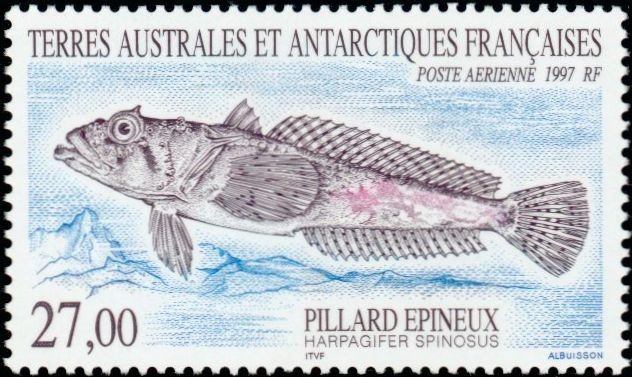 Visibility: public Image owner: none airmail 1/1/1997 27.00fr multi issue=Antarctic Fauna 1997 d=Harpagifer spinosus unwmk Crops No visible images cropped from this one. Measurements Resolution is unknown. Source Source name: Colnect File URL: http://i.colnect.net/b/1050/078/Deepwater-Spiny-Plunderfish-Harpagifer-spinosus.jpg Uploaded June 23, 2014, 2:00 pm by Stan Shebs |