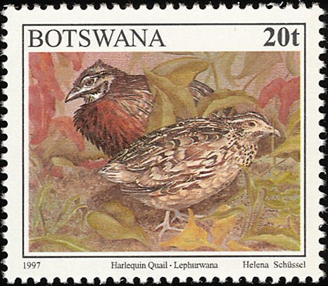 Visibility: public Image owner: none postage 8/4/1997 20t multi issue=1997 dt=birds (1997 Botswana) d=Harlequin quail unwmk perf=13.25 Crops No visible images cropped from this one. Measurements Resolution is unknown. Source Source name: Colnect File URL: http://i.colnect.net/b/1011/695/Harlequin-Quail-Coturnix-delegorguei.jpg Uploaded September 5, 2014, 7:00 pm by Stan Shebs |