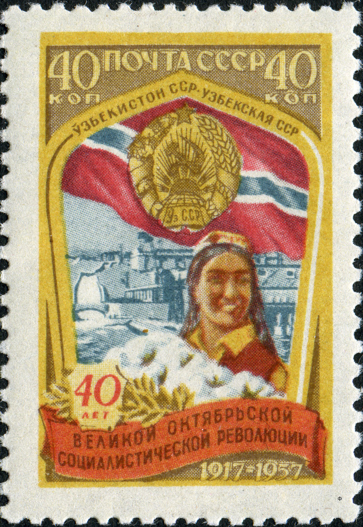 Visibility: public Image owner: none postage 10/25/1957 40k multi issue=revolution 40th b d=symbols of Uzbek SSR unwmk perf=12 Crops No visible images cropped from this one. Measurements Resolution is 1200 dpi, size is 26.5 x 38.5 mm. Source Source name: Wikimedia Commons File URL: http://upload.wikimedia.org/wikipedia/commons/b/b8/Stamp_of_USSR_2080.jpg Uploaded April 7, 2012, 5:51 pm by Stan Shebs |