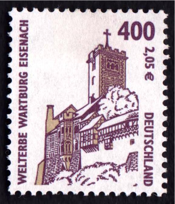 Visibility: public Image owner: none postage 9/5/2001 400(pf)|2,05€ multi issue=1994 dt=tourist attractions d=Wartburg at Eisenach unwmk perf=14 Crops No visible images cropped from this one. Measurements Resolution is unknown. Source Source name: Wikimedia Commons File URL: http://upload.wikimedia.org/wikipedia/commons/0/00/Stamps_of_Germany_%28BRD%29_2001%2C_MiNr_2211.jpg Uploaded April 15, 2012, 6:39 pm by Stan Shebs |