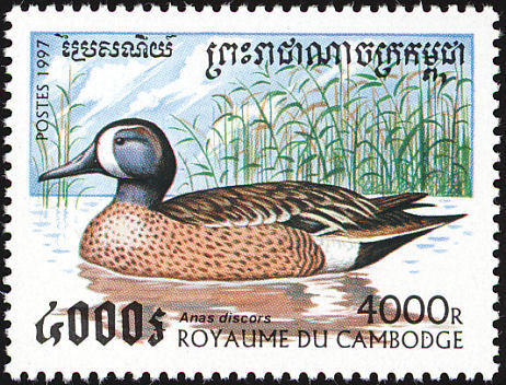 Visibility: public Image owner: none postage 4/7/1997 4000r multi dt=ducks (1997) d=Anas discors (1997 Cambodia) unwmk Crops No visible images cropped from this one. Measurements Resolution is unknown. Source Source name: Colnect File URL: http://i.colnect.net/images/b/1527/007/Blue-winged-Teal-Anas-discors.jpg Uploaded September 10, 2014, 7:08 pm by Stan Shebs |