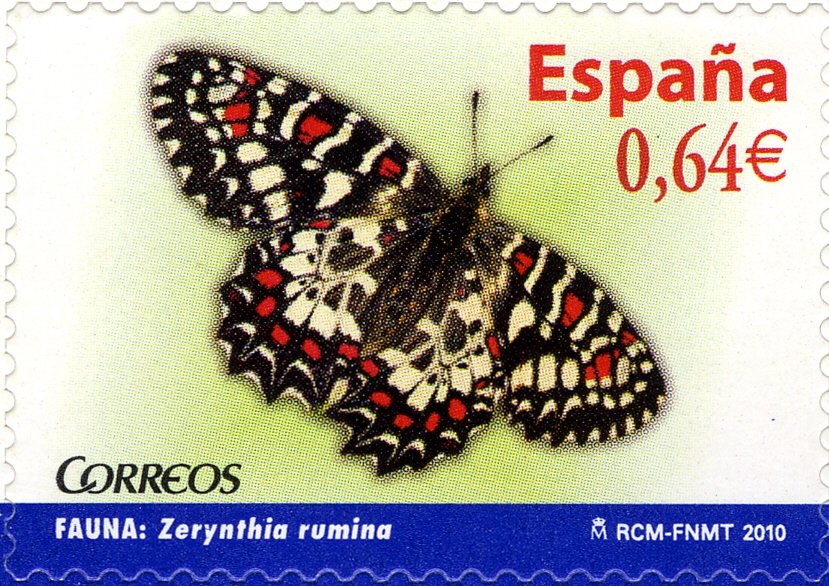 Visibility: public Image owner: none postage 4/1/2010 0,64€ multi dt=fauna (2010 Spain) d=Zerynthia rumina (2010) unwmk perf=14 Crops No visible images cropped from this one. Measurements Resolution is unknown. Source Source name: Colnect File URL: http://i.colnect.net/b/572/786/Spanish-Festoon-Zerynthia-rumina.jpg Uploaded August 29, 2013, 11:22 pm by Stan Shebs |