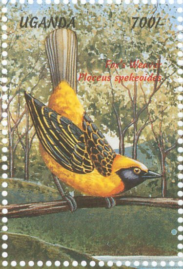 Visibility: public Image owner: none postage 12/1/1999 700sh multi issue=Birds of Uganda 1999 dt=birds of Uganda (1999) d=Fox's weaver Ploceus spekeoides unwmk perf=14.25 Crops No visible images cropped from this one. Measurements Resolution is unknown. Source Source name: Colnect File URL: http://i.colnect.net/b/1715/800/Fox-s-Weaver-Ploceus-spekeoides.jpg Uploaded September 16, 2014, 6:30 pm by Stan Shebs |