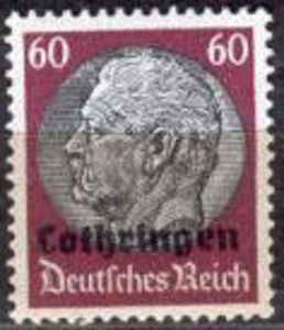 Visibility: public Image owner: none postage 60pf plum&grayblk issue=1940 d=Hindenburg (profile) ovpt=Lothringen oc=blk on=issuer=Germany-issue=1933-60pf wmk=network perf=14 Crops No visible images cropped from this one. Measurements Resolution is unknown. Source Source name: Colnect (old) File URL: http://i.colnect.net/images/f/547/216/Overprint-LOTHRINGEN-Over-Hindenburg.jpg Uploaded August 26, 2012, 6:06 am by Stan Shebs |