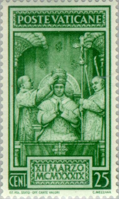 Visibility: public Image owner: none postage 6/2/1939 25c grn issue=Pius XII coronation unwmk Crops No visible images cropped from this one. Measurements Resolution is unknown. Source Source name: Colnect File URL: http://i.colnect.net/b/150/380/Pope-Pius-XII--Coronation.jpg Uploaded August 16, 2014, 5:39 pm by Stan Shebs |
