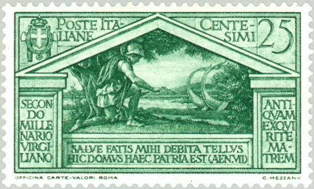Visibility: public Image owner: none postage 10/21/1930 25c grn issue=Virgil 2000th d=Aeneas landed on the Tiber greets the new land wmk=crown (Italy) perf=14 Crops No visible images cropped from this one. Measurements Resolution is unknown. Source Source name: Colnect File URL: http://i.colnect.net/b/167/139/Aeneas-landed-on-the-Tiber-greets-the-new-land.jpg Uploaded August 18, 2014, 3:34 pm by Stan Shebs |