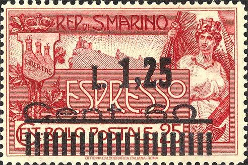 Visibility: public Image owner: none special delivery 9/15/1927 1.25l car d=Monte Titano ovpt=L. 1,25//bars oc=blk on=7/26/1923-60c unwmk perf=14 Crops No visible images cropped from this one. Measurements Resolution is unknown. Source Source name: Colnect File URL: http://i.colnect.net/images/b/501/958/Express-overprint.jpg Uploaded August 21, 2014, 5:05 pm by Stan Shebs |