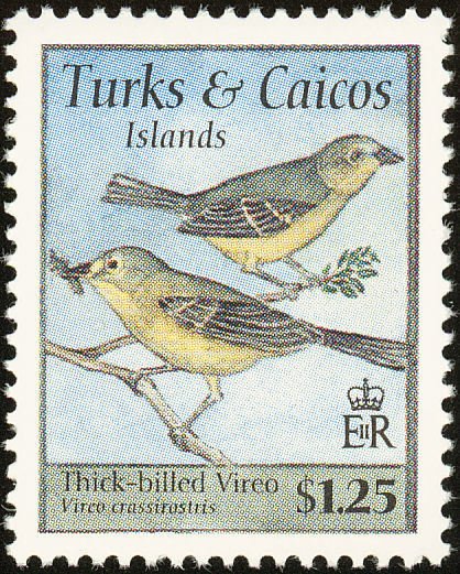 Visibility: public Image owner: none postage 8/2/1995 $1.25 multi dt=birds (1995 Turks & Caicos Islands) d=Vireo crassirostris (1995) wmk=mult crown & script CA Crops No visible images cropped from this one. Measurements Resolution is unknown. Source Source name: Colnect File URL: http://i.colnect.net/b/1764/394/Thick-billed-Vireo-Vireo-crassirostris.jpg Uploaded November 25, 2013, 6:42 pm by Stan Shebs |