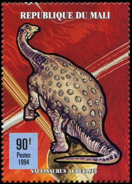 Visibility: public Image owner: none postage 3/28/1994 90fr multi dt=prehistoric animals (1994 Mali) d=Saltasaurus unwmk perf=13.25 Crops No visible images cropped from this one. Measurements Resolution is unknown. Source Source name: Colnect File URL: http://i.colnect.net/b/1863/062/Saltasaurus.jpg Uploaded December 23, 2013, 5:33 pm by Stan Shebs |