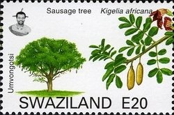 Visibility: public Image owner: none postage 1/23/2007 20.00e multi dt=trees of Swaziland d=Kigelia africana (2007) unwmk Crops No visible images cropped from this one. Measurements Resolution is unknown. Source Source name: Colnect File URL: http://i.colnect.net/b/1696/656/Sausage-Tree-Kigelia-africana.jpg Uploaded December 28, 2013, 4:55 am by Stan Shebs |