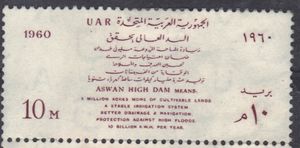 Visibility: public Image owner: none postage 1/9/1960 10m issue=Aswan hydroelectric station opening wmk=UAR Crops No visible images cropped from this one. Measurements Resolution is unknown. Source Source name: Colnect (old) File URL: http://i.colnect.net/images/f/1025/756/Description-of-Aswan-High-Dam.jpg Uploaded October 19, 2012, 3:41 am by Stan Shebs |