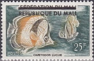 Visibility: public Image owner: none postage 1/15/1961 25fr dt=fishes (1960 Mali Federation) d=Chaetodon luciae ovpt=bar//REPUBLIQUE DU MALI oc=blk on=issuer=Mali Federation-1960-25fr-dt=fishes unwmk Crops No visible images cropped from this one. Measurements Resolution is unknown. Source Source name: Colnect File URL: http://i.colnect.net/b/2074/257/Three-banded-Butterflyfish-Chaetodon-luciae.jpg Uploaded July 1, 2014, 3:19 pm by Stan Shebs |