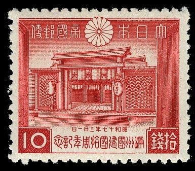 Visibility: public Image owner: none postage 3/1/1942 10s red issue=Manchukuo founding d=Kenkoku Shrine wmk=curved wavy lines perf=12 Crops No visible images cropped from this one. Measurements Resolution is unknown. Source Source name: Colnect File URL: http://i.colnect.net/b/822/689/Kenkoku-Temple-Shimbyo---Shinkyo-today-Changchun.jpg Uploaded August 22, 2014, 9:28 pm by Stan Shebs |
