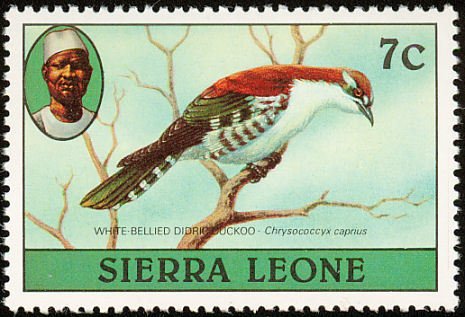 Visibility: public Image owner: none postage 1/29/1980 7c multi issue=1980 dt=birds (1980 Sierra Leone) d=Diederic Cuckoo wmk=crown & CA spiral Crops No visible images cropped from this one. Measurements Resolution is unknown. Source Source name: Colnect File URL: http://i.colnect.net/b/2274/021/Diederik-Cuckoo Chrysococcyx-caprius.jpg Uploaded December 23, 2014, 4:35 pm by Stan Shebs |