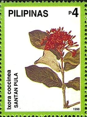 Visibility: public Image owner: none postage 5/29/1998 4p multi issue=Florikultura '98 d=Ixora coccinea (1998) unwmk perf=14 Crops No visible images cropped from this one. Measurements Resolution is unknown. Source Source name: Colnect File URL: http://i.colnect.net/images/b/2335/392/Ixora-coccinea.jpg Uploaded February 21, 2015, 6:42 pm by Stan Shebs |