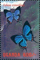 Visibility: public Image owner: none postage 5/24/2000 600sh multi issue=Stamp Show 2000 dt=butterflies (2000 Uganda) d=Iolaus crawshayi unwmk perf=14.25 Crops No visible images cropped from this one. Measurements Resolution is unknown. Source Source name: Colnect File URL: http://i.colnect.net/b/2631/386/Crawshay-s-Sapphire-Iolaus-crawshayi.jpg Uploaded August 20, 2015, 9:10 pm by Stan Shebs |