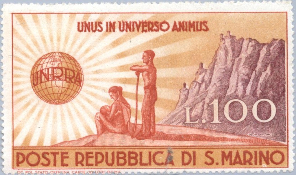 |   (1024 x 604 pixels) | Type: stamp Issuer: San Marino  Date: 1946 Denom: ? Visibility: public Image owner: none postage 100l issue=UN Relief&Rehabilitation Administration unwmk Crops No visible images cropped from this one. Measurements Resolution is unknown. Source Source name: Colnect File URL: http://i.colnect.net/b/168/442/UNRRA.jpg Uploaded August 23, 2014, 4:30 pm by Stan Shebs |