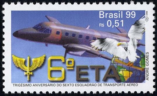 |   (539 x 330 pixels) | Type: stamp Issuer: Brazil  Date: 1999 Denom: ? Visibility: public Image owner: none postage 5/12/1999 0.51r multi issue=30th Anniversary of the Sixth Air Transportation Squadron unwmk perf=11x11.5 Crops No visible images cropped from this one. Measurements Resolution is unknown. Source Source name: Colnect File URL: http://i.colnect.net/b/2288/345/30-years-ETA.jpg Uploaded September 5, 2015, 12:54 am by Stan Shebs |