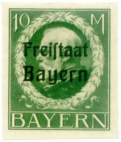 Visibility: public Image owner: none postage 8/6/1919 10m yelgrn issue=1919e d=King Ludwig III (wreath) ovpt=Freistaat//Bayern(roman) oc=blk on=1916-10m-yelgrn-imperf wmk=horiz wavy lines close imperf Crops No visible images cropped from this one. Measurements Resolution is unknown. Source Source name: Colnect File URL: http://i.colnect.net/b/1852/147/Freistaat-on-Ludwig-III.jpg Uploaded October 22, 2015, 1:52 am by Stan Shebs |