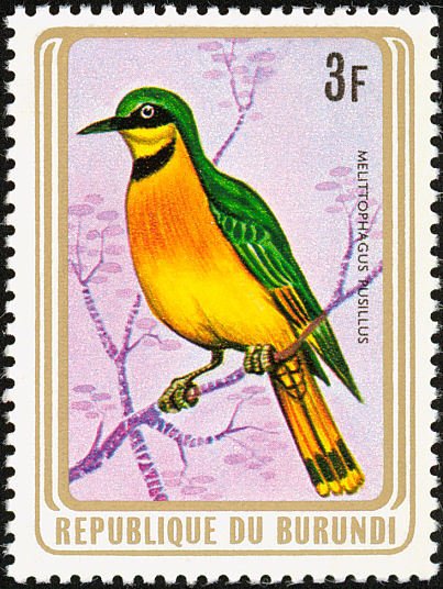 Visibility: public Image owner: none postage 5/30/1979 3fr multi issue=Birds 1979 dt=birds (1979 Burundi) d=Melittophagus pusillus (1979) unwmk Crops No visible images cropped from this one. Measurements Resolution is unknown. Source Source name: Colnect File URL: http://i.colnect.net/b/3097/625/Little-Bee-eater-Merops-pusillus.jpg Uploaded May 23, 2016, 3:29 pm by Stan Shebs |