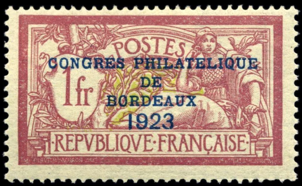 Visibility: public Image owner: none postage 6/15/1923 1fr cl<olgrn d=Liberty & Peace ovpt=CONGRES PHILATELIQUE//DE//BORDEAUX//1923 oc=blk on=1900-1fr unwmk perf=14x13.5 Crops No visible images cropped from this one. Measurements Resolution is unknown. Source Source name: Colnect File URL: http://i.colnect.net/b/2651/130/Philatelic-congress-surchargé--BORDEAUX-.jpg Uploaded June 9, 2016, 3:59 pm by Stan Shebs |
