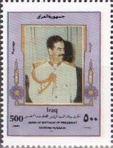 Visibility: public Image owner: none postage 4/28/1999 500d multi issue=62nd birthday of President Saddam Hussein unwmk perf=14 Crops No visible images cropped from this one. Measurements Resolution is unknown. Source Source name: Colnect File URL: http://i.colnect.net/images/b/2587/999/Saddam-Hussein-1937-2006-president.jpg Uploaded June 19, 2016, 9:46 pm by Stan Shebs |