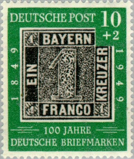 Visibility: public Image owner: none semipostal 9/30/1949 10pf+2pf grn&blk issue=German stamp 100th dt=stamp on stamp d=1849 Bavarian stamp wmk=marbleized pattern perf=14 Crops No visible images cropped from this one. Measurements Resolution is unknown. Source Source name: Colnect File URL: http://i.colnect.net/images/b/152/079/Bavaria--1.jpg Uploaded August 24, 2014, 9:05 pm by Stan Shebs |