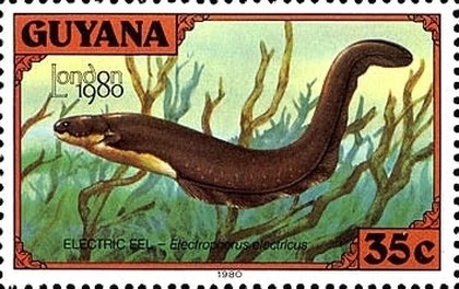 Visibility: public Image owner: none postage 5/6/1980 35c issue=London 1980 dt=fishes (1980 Guyana) d=Electrophorus electricus (1980) wmk=crown & CA spiral Crops No visible images cropped from this one. Measurements Resolution is unknown. Source Source name: Colnect File URL: http://i.colnect.net/b/3726/771/Electric-Eel-Electrophorus-electricus.jpg Uploaded May 1, 2017, 5:23 pm by Stan Shebs |
