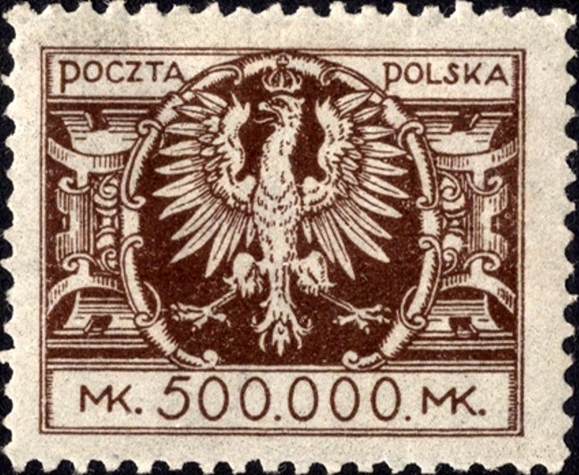 Visibility: public Image owner: none postage 500000m brn d=arms of Poland (1924 a) unwmk perf=9-14.5 Crops No visible images cropped from this one. Measurements Resolution is unknown. Source Source name: Colnect File URL: http://i.colnect.net/b/3966/509/Eagle-on-a-large-baroque-shield.jpg Uploaded May 30, 2017, 9:16 pm by Stan Shebs |