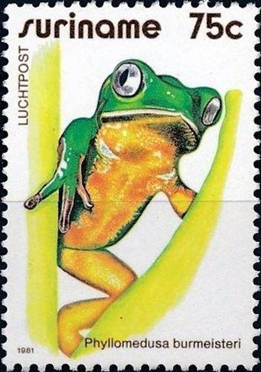 Visibility: public Image owner: none airmail 6/24/1981 75c multi issue=Frogs 1981 dt=frogs (1981) d=Phyllomedusa burmeisteri unwmk perf=14x13 Crops No visible images cropped from this one. Measurements Resolution is unknown. Source Source name: Colnect File URL: http://i.colnect.net/b/3596/548/Phyllomedusa-burmeisteri.jpg Uploaded June 10, 2017, 3:21 am by Stan Shebs |