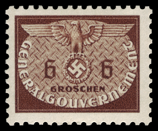 Visibility: public Image owner: none official 7/22/1940 brn issue=1940 official smaller d=eagle over swastika unwmk Crops No visible images cropped from this one. Measurements Resolution is unknown. Source Source name: Wikimedia Commons File URL: http://upload.wikimedia.org/wikipedia/commons/0/01/Generalgouvernement_1940_D16_Dienstmarke.jpg Uploaded November 24, 2011, 8:53 pm by Stan Shebs |