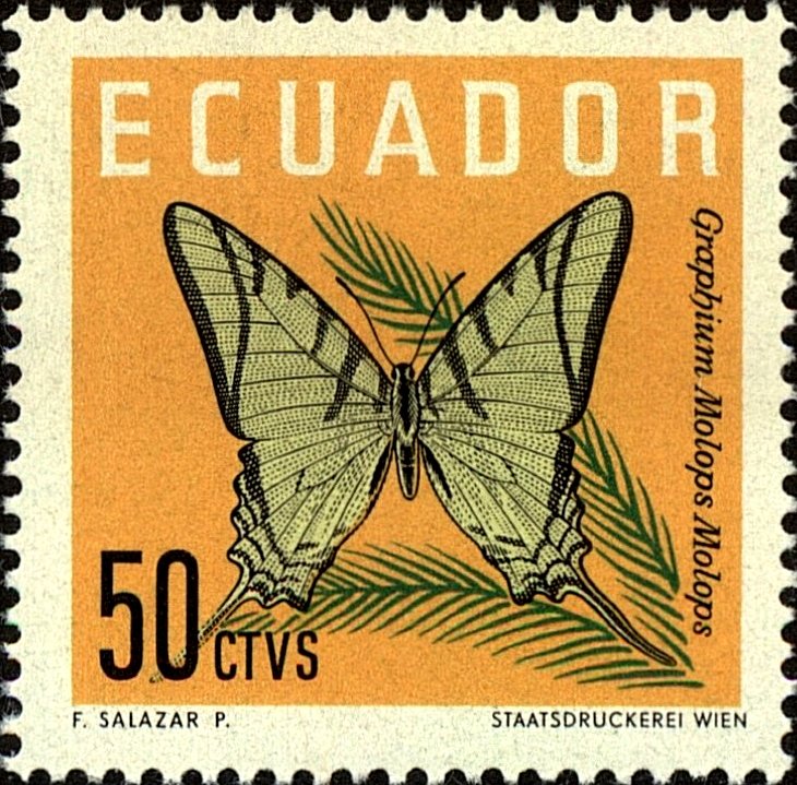 Visibility: public Image owner: none postage 7/13/1961 50c dt=butterflies (1961 Ecuador) d=Graphium molops molops (1961) unwmk perf=12 Crops No visible images cropped from this one. Measurements Resolution is unknown. Source Source name: Colnect File URL: http://i.colnect.net/b/3947/138/Swallowtail-Graphium-molops.jpg Uploaded November 6, 2017, 5:54 pm by Stan Shebs |