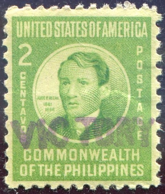 Visibility: public Image owner: none postage 11/8/1944 2c grn issue=victory a d=Jose Rizal (1941) ovpt=VICTORY(handstamp) oc=vio on=1941-2c-grn-Jose Rizal (1911) unwmk perf=11x10.5 Crops No visible images cropped from this one. Measurements Resolution is unknown. Source Source name: Colnect File URL: http://i.colnect.net/b/4465/007/José-Rizal-1861-1896.jpg Uploaded December 27, 2017, 8:21 pm by Stan Shebs |