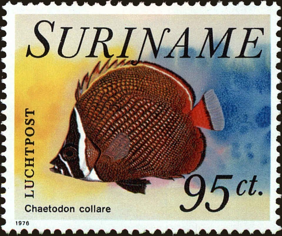 Visibility: public Image owner: none postage 6/2/1976 95c multi issue=1976 dt=fishes (1976 Surinam) d=Airmail - Chaetodon collare unwmk perf=12.5x13 Crops No visible images cropped from this one. Measurements Resolution is unknown. Source Source name: Colnect File URL: http://i.colnect.net/b/4977/824/Redtail-Butterflyfish-Chaetodon-collare.jpg Uploaded July 12, 2018, 7:07 pm by Stan Shebs |