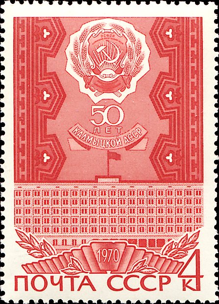 Visibility: public Image owner: none postage 5/27/1970 4k red issue=republic anniversaries d=Kalmyk ASSR unwmk perf=12 Crops No visible images cropped from this one. Measurements Resolution is unknown. Source Source name: Colnect File URL: http://i.colnect.net/b/4571/399/Kalmyk-ASSR-Arms-Supreme-Soviet-Building-in-Elista.jpg Uploaded July 25, 2018, 5:52 pm by Stan Shebs |