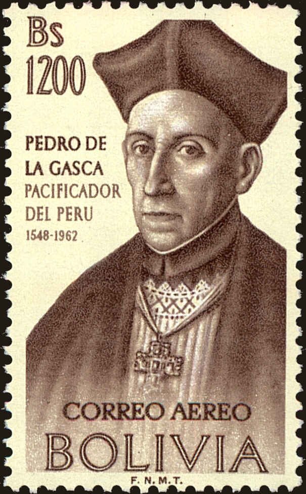 Visibility: public Image owner: none airmail 12/5/1962 1200b multi&brn issue=Spanish Discoverers d=Pedro de la Gasca unwmk Crops No visible images cropped from this one. Measurements Resolution is unknown. Source Source name: Colnect File URL: http://i.colnect.net/b/5504/863/Pedro-de-la-Gasca.jpg Uploaded January 18, 2019, 7:50 pm by Stan Shebs |
