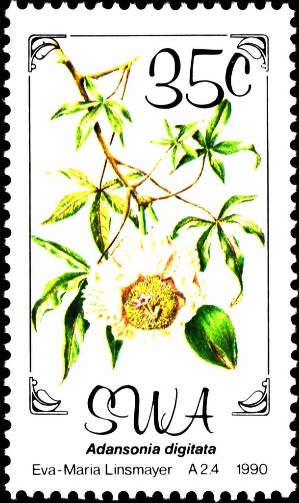 Visibility: public Image owner: none postage 2/1/1990 35c multi dt=plants (1990 South West Africa) wmk=RSA in triangle Crops No visible images cropped from this one. Measurements Resolution is unknown. Source Source name: Colnect File URL: http://i.colnect.net/b/5253/567/Flowers--Adansonia-digitata.jpg Uploaded March 25, 2019, 12:32 am by Stan Shebs |