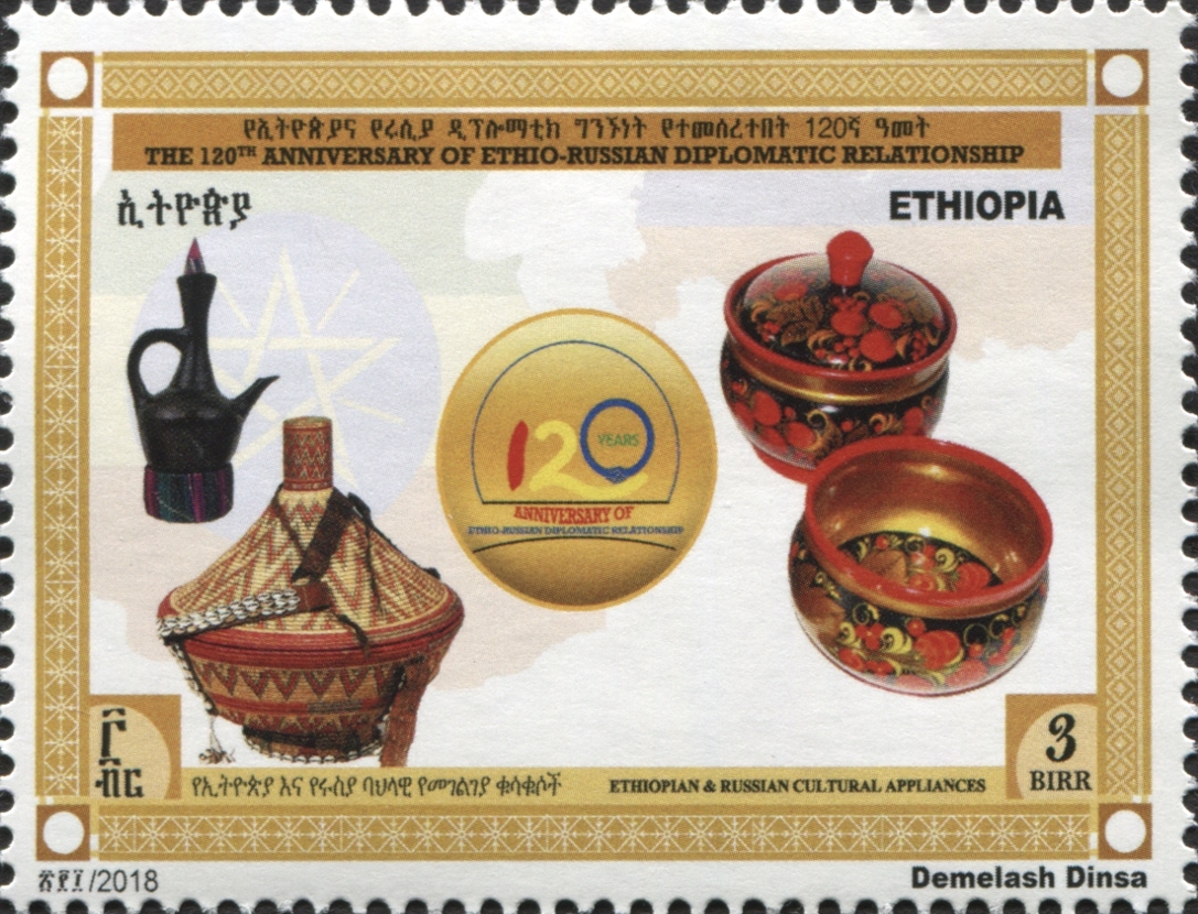 Visibility: public Image owner: none postage 12/28/2018 3.00b multi issue=120th Anniversary of the Establishment of Ethiopia and Russia Diplomatic Relationships d=Traditional tableware & household appliances of Ethiopia and Russia unwmk perf=13 Crops No visible images cropped from this one. Measurements Resolution is unknown. Source Source name: WNS File URL: http://www.wnsstamps.post//stamps/2018/ET/ET017.18.jpg Uploaded April 26, 2019, 3:54 am by Stan Shebs |
