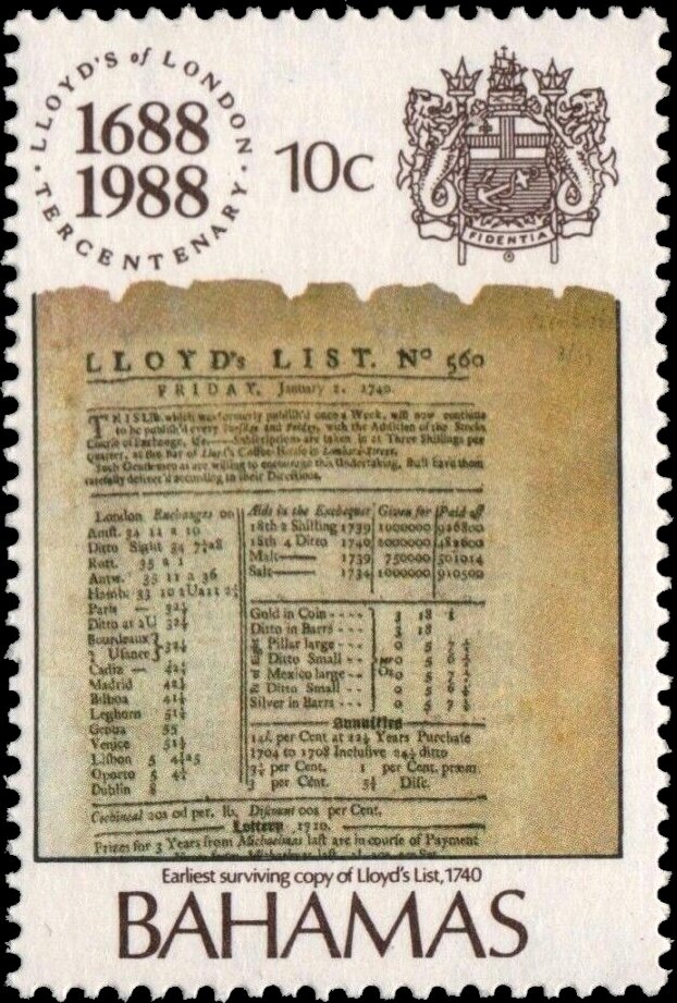 Visibility: public Image owner: none postage 10/4/1988 10c multi issue=300th Anniversary of Lloyd's of London d=Lloyds List No 560 1740 wmk=mult crown & script CA perf=14 Crops No visible images cropped from this one. Measurements Resolution is unknown. Source Source name: Colnect File URL: http://i.colnect.net/b/5867/318/Lloyds-List-No-560-1740.jpg Uploaded November 7, 2019, 9:03 pm by Stan Shebs |