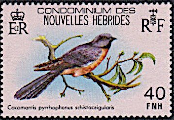 Visibility: public Image owner: none postage 2/27/1980 40fnh multi dt=birds (1980 New Hebrides (Fr)) d=Cacomantis pyrrhophanes unwmk perf=14.25x14 Crops No visible images cropped from this one. Measurements Resolution is unknown. Source Source name: Colnect File URL: http://i.colnect.net/b/5706/735/Cacomantis-pyrrhophanes.jpg Uploaded November 22, 2019, 9:30 pm by Stan Shebs |