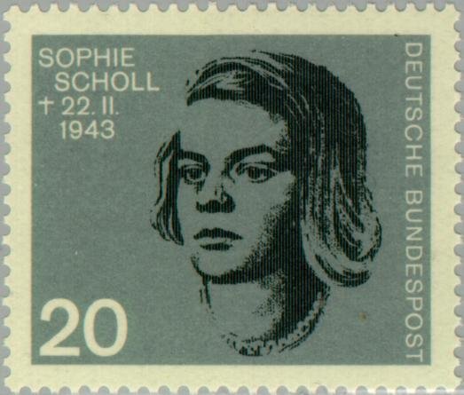 Visibility: public Image owner: none postage 7/20/1964 20(pf) blk&dkblgray issue=resistance d=Sophie Scholl (1964) perf=14 Crops No visible images cropped from this one. Measurements Resolution is unknown. Source Source name: Colnect File URL: http://i.colnect.net/images/b/152/474/Scholl-Sophie.jpg Uploaded August 27, 2014, 3:06 pm by Stan Shebs |