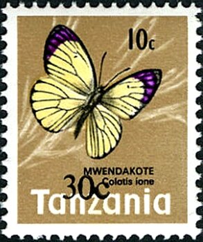 Visibility: public Image owner: none postage 30c multi dt=butterflies (1973 Tanzania) d=Colotis ione (1973) ovpt=30c oc=blk on=1973-10c unwmk Crops No visible images cropped from this one. Measurements Resolution is unknown. Source Source name: Colnect File URL: http://i.colnect.net/b/6080/194/Bushveld-Purple-Tip-Colotis-ione.jpg Uploaded January 27, 2020, 9:20 pm by Stan Shebs |