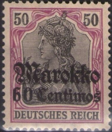 Visibility: public Image owner: none Current identification: postage 1911 60c pur&blk pc=sal issue=1911 d=Germania (Deutsches Reich) ovpt=Marokko//value oc=blk on=issuer=Germany-1902-50pf unwmk perf=14x14.25 Crops No visible images cropped from this one. Measurements Resolution is unknown. Source Source name: Colnect File URL: http://i.colnect.net/b/6220/560/›-overprint-on--Germania-.jpg Uploaded March 4, 2020, 10:41 pm by Stan Shebs |