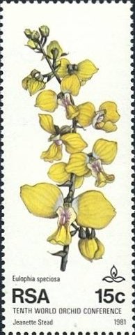 Visibility: public Image owner: none postage 9/11/1981 15c multi issue=10th World Orchid Conference dt=orchids (1981 South Africa) d=Eulophia speciosa (1981) wmk=RSA in triangle Crops No visible images cropped from this one. Measurements Resolution is unknown. Source Source name: Colnect File URL: http://i.colnect.net/images/b/801/669/Eulophia-speciosa.jpg Uploaded August 29, 2014, 7:09 pm by Stan Shebs |