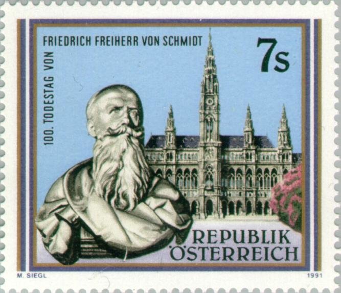 Visibility: public Image owner: none postage 1/21/1991 7s multi issue=Friedrich Freiherr von Schmidt death 100th d=Friedrich von Schmidt & Vienna City Hall unwmk perf=13.75x14 Crops No visible images cropped from this one. Measurements Resolution is unknown. Source Source name: Colnect File URL: http://i.colnect.net/b/137/466/Memorial-Centenary-of-Friedrich-von-Schmidt.jpg Uploaded September 2, 2014, 4:38 pm by Stan Shebs |