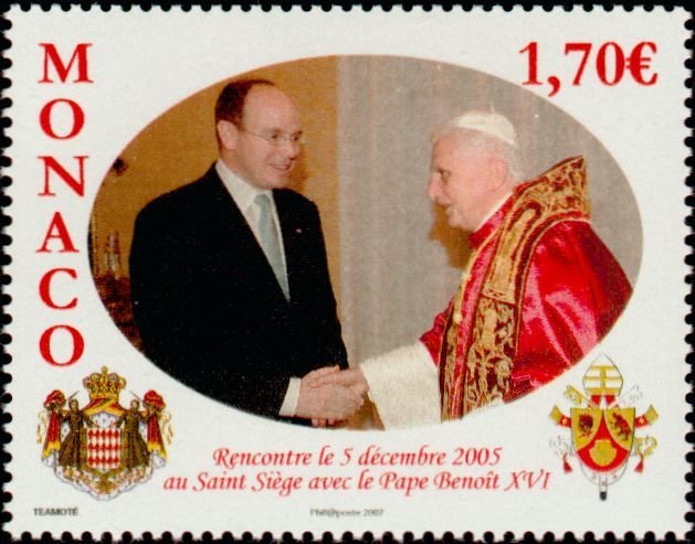 Visibility: public Image owner: none postage 12/1/2006 1.70€ multi issue=Visit of Prince Albert II to Pope Benedict XVI unwmk Crops No visible images cropped from this one. Measurements Resolution is unknown. Source Source name: Colnect File URL: http://i.colnect.net/images/b/1099/651/Prince-Albert-II-1958-and-Pope-Benedict-XVI-1927.jpg Uploaded September 15, 2014, 9:57 pm by Stan Shebs |