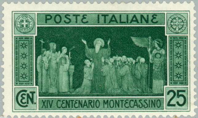Visibility: public Image owner: none postage 8/1/1929 25c dkgrn issue=Monte Cassino 1400th d=death of St Benedict wmk=crown (Italy) perf=14 Crops No visible images cropped from this one. Measurements Resolution is unknown. Source Source name: Colnect File URL: http://i.colnect.net/b/167/062/Death-of-St-Benedict.jpg Uploaded August 18, 2014, 3:34 pm by Stan Shebs |