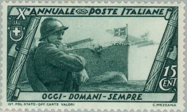 Visibility: public Image owner: none postage 10/27/1932 15c dkgrn issue=Fascist government 10th d=Army Navy & Air Force wmk=crown (Italy) perf=14 Crops No visible images cropped from this one. Measurements Resolution is unknown. Source Source name: Colnect File URL: http://i.colnect.net/b/167/326/Army-Navy-and-Air-Force.jpg Uploaded August 18, 2014, 3:36 pm by Stan Shebs |
