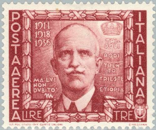 Visibility: public Image owner: none airmail 10/28/1938 3l redbrn issue=proclamation of Empire d=Victor Emmanuel III (1938) wmk=crown (Italy) perf=14 Crops No visible images cropped from this one. Measurements Resolution is unknown. Source Source name: Colnect File URL: http://i.colnect.net/b/188/211/Proclamation-of-the-Empire--Victor-Emmanuel-III.jpg Uploaded August 18, 2014, 3:51 pm by Stan Shebs |