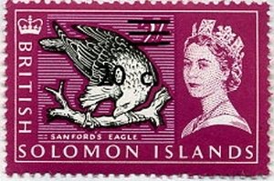 Visibility: public Image owner: none postage 2/14/1966 20c issue=1966 d=Sanford's Eagle & Queen Elizabeth II ovpt=value oc=blk on=5/24/1965-2sh wmk=St Edwards crown & CA perf=13x12.5 Crops No visible images cropped from this one. Measurements Resolution is unknown. Source Source name: Colnect File URL: http://i.colnect.net/b/1401/536/Sanford-s-Sea-Eagle-Haliaeëtus-sanfordi.jpg Uploaded December 27, 2013, 1:24 pm by Stan Shebs |